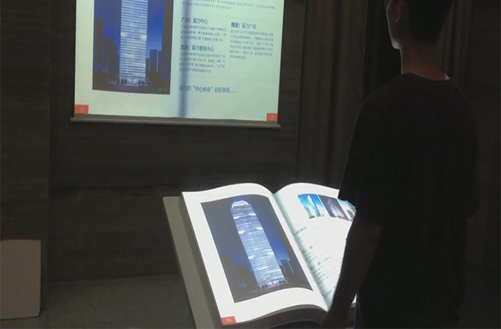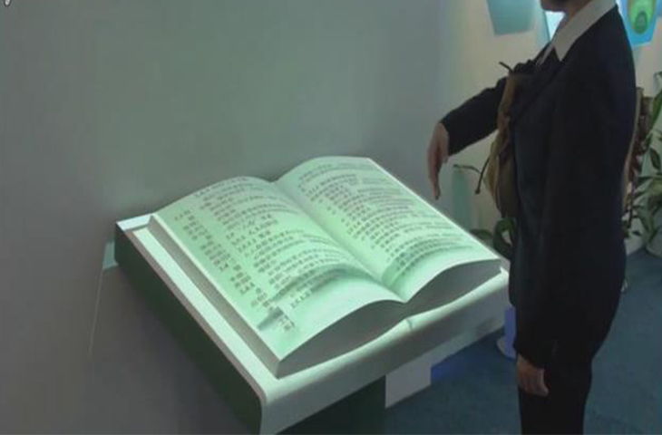 電子翻書:主要是由電子設備和投影技術組成,它不同于空中翻書是飄在空中的,是有實體的書模型,上面是投影機投射下的內容,人在做出翻書動作的同時也會發(fā)生脆脆的聲響,就像正在看普通書籍樣。