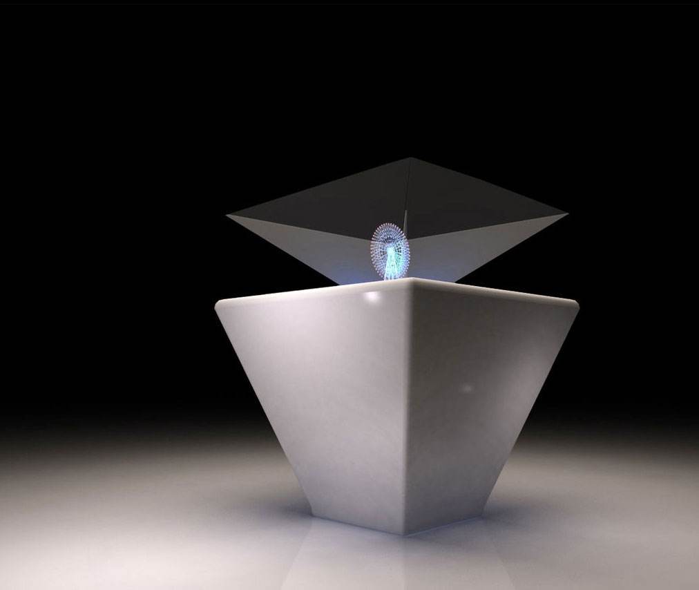 360度幻影成像又稱(chēng)三維全息、懸浮成像等等名稱(chēng)。主要是由透明材質(zhì)制作成四面錐體,將三維畫(huà)面懸浮在四面錐體中。通過(guò)對(duì)產(chǎn)品實(shí)拍構(gòu)建三維模型,然后將拍攝的產(chǎn)品三維模型影像加進(jìn)場(chǎng)景中,,三維畫(huà)面飄浮在實(shí)景的半空中構(gòu)成靜態(tài)與動(dòng)態(tài)結(jié)合的產(chǎn)品展示,在沒(méi)有束縛的情況下不需佩戴3D眼鏡,便可觀看3D立體顯示特效,讓人感受到視覺(jué)上的沖突.仿佛看到一個(gè)真實(shí)的場(chǎng)景中。