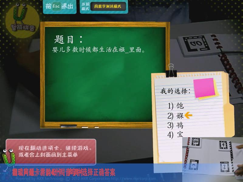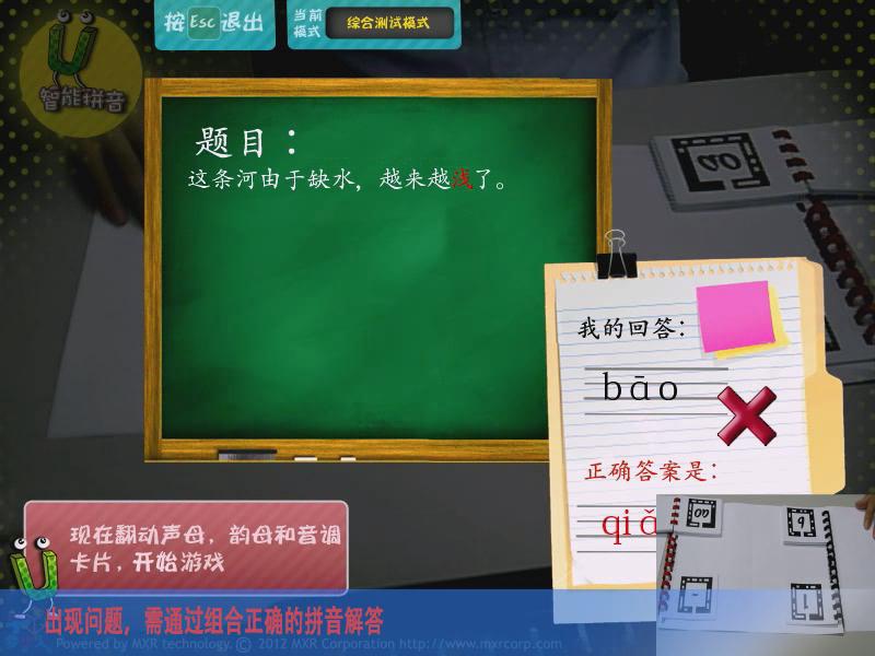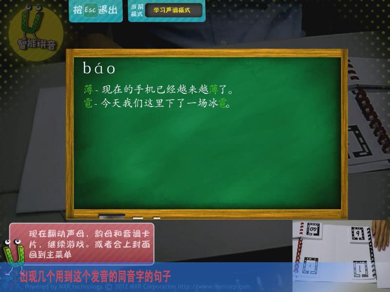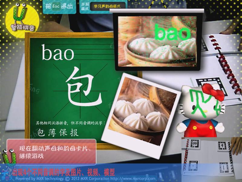 通過AR游戲的形式,讓參與者能夠?qū)W習拼音,主要分為靴子聲韻母、聲調(diào)、同音字測試、綜合測試四大模式,讓學習拼音變得更加有趣。